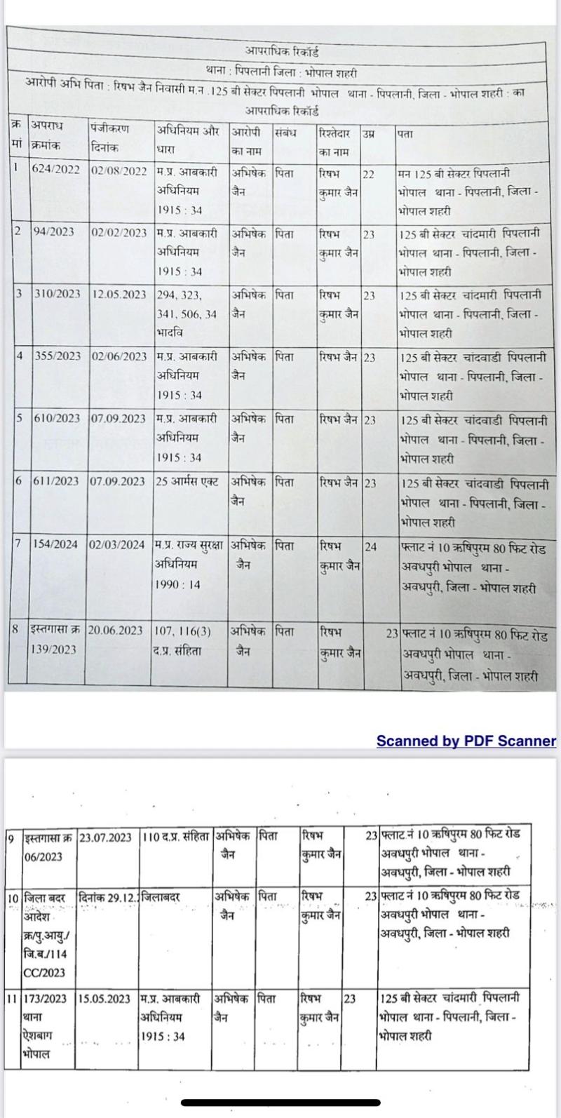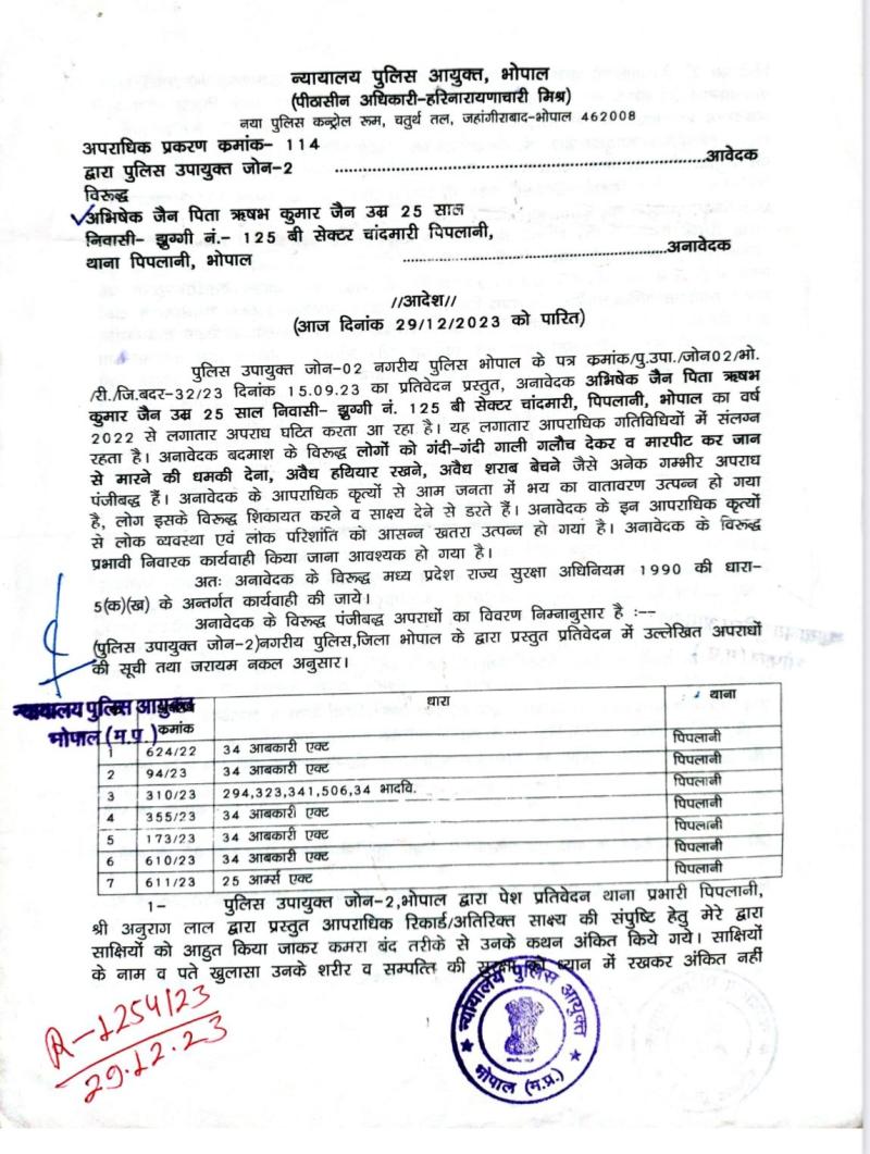 अपराध की दुनिया में अभिषेक जैन जाना माना नाम है थाना पिपलानी भोपाल पुलिस के अपराध रजिस्टर में लिस्टेड गुंडे के देखा जा सकता है जिसके विरुद्ध थाना पिपलानी, ऐशबाग भोपाल व अन्य थानों में करीब एक दर्जन से अधिक अपराध शराब तस्करी, अवैध हथियार, मारपीट के दर्ज है। वहीं आधा दर्जन facebook पर अड़ीबाजी की शिकायते जांच में है । अभिषेक किसी भी व्यक्ति को ठगने के लिये उसके बारे में भ्रामक जानकारी सोशल मीडिया के माध्यम से पोस्ट करता है संबंधित पर दबाब बनाकर पैसे बसूलना, का काम करता है एवं काम होने पर उसी पोस्ट को खंडन कर के डिलीट कर देता है। जिससे स्पष्ट है कि अभिषेक जैन अपने भेड़िया रुप को छुपाने के लिये सामाजिक कार्यकर्ता का मुखौटा पहनने की कोशिश कर रहा है । यही जिलाबदर बार बार मुख्यमत्री प्रधानमंत्री से मिलने का दावा करके लोगो को डराता है ।