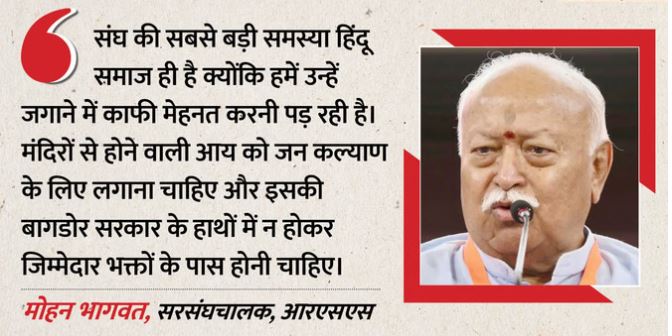 लखनऊ|राष्ट्रीय स्वयंसेवक संघ के सरसंघचालक डॉ. मोहन भागवत ने कहा कि मंदिरों की कमाई का बड़ा हिस्सा जन कल्याण में लगना चाहिए। वे आरएसएस के सौ वर्ष पूरे होने के उपलक्ष्य में लखनऊ में अपने दो दिवसीय प्रवास के दौरान अंतिम दिन इंदिरा गांधी प्रतिष्ठान में आयोजित प्रमुख जन गोष्ठी को संबोधित कर रहे थे। इस दौरान उन्होंने अलग-अलग क्षेत्रों से आए प्रबुद्धजनों के सवालों के जवाब दिए। लालता प्रसाद मिश्र के सवाल के जवाब में उन्होंने कहा कि संघ की सबसे बड़ी समस्या हिंदू समाज ही है क्योंकि हमें उन्हें जगाने में काफी मेहनत करनी पड़ रही है।डॉ. श्वेता श्रीवास्तव और कर्नल एमके सिंह के सवाल के जवाब में डॉ. मोहन भागवत ने कहा कि मंदिरों से होने वाली आय को जन कल्याण के लिए लगाना चाहिए और इसकी बागडोर सरकार के हाथों में न होकर जिम्मेदार भक्तों के पास होनी चाहिए। उन्होंने कहा कि देश के प्रमुख मंदिरों के संचालन और आय के जन कल्याण के लिए खर्च किए जाने की प्रक्रिया पारदर्शी हो और निष्पक्ष व ईमानदार संस्था की निगरानी में हो। उन्होंने कहा कि संघ इस दिशा में आगे तैयारी कर रहा है, जल्द परिणाम देखने को मिलेगा।