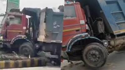 रेलिंग तोड़कर राउंडअबाउट में घुसा ट्रक, मची अफरा-तफरी