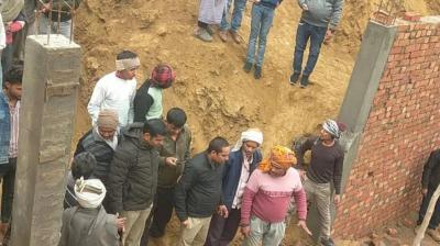 दीवार गिरने से मची अफरा-तफरी, 60 फीट नीचे बेसमेंट में फंसे मजदूर